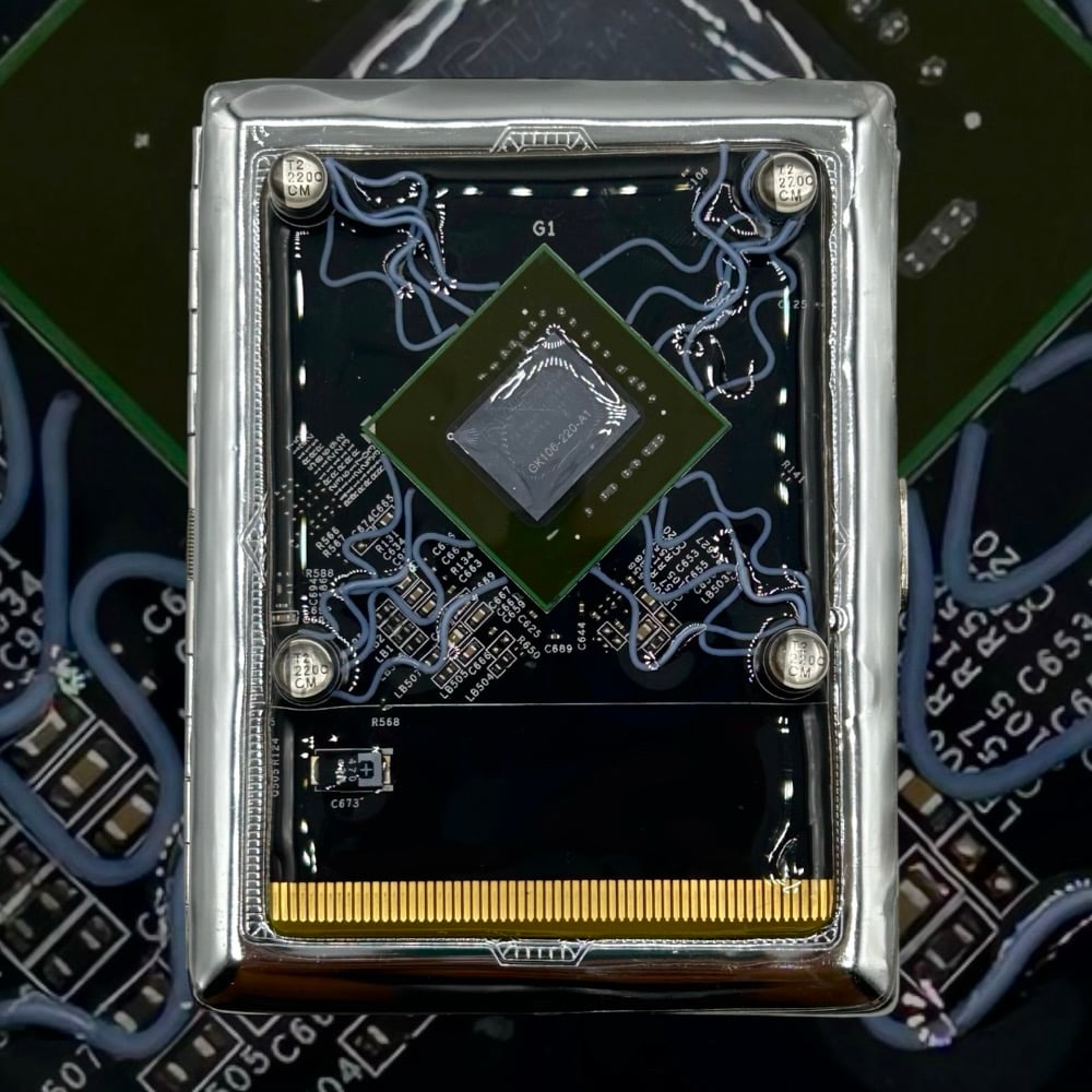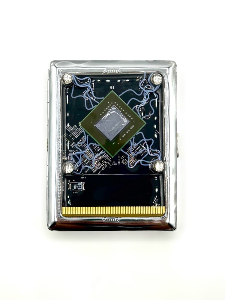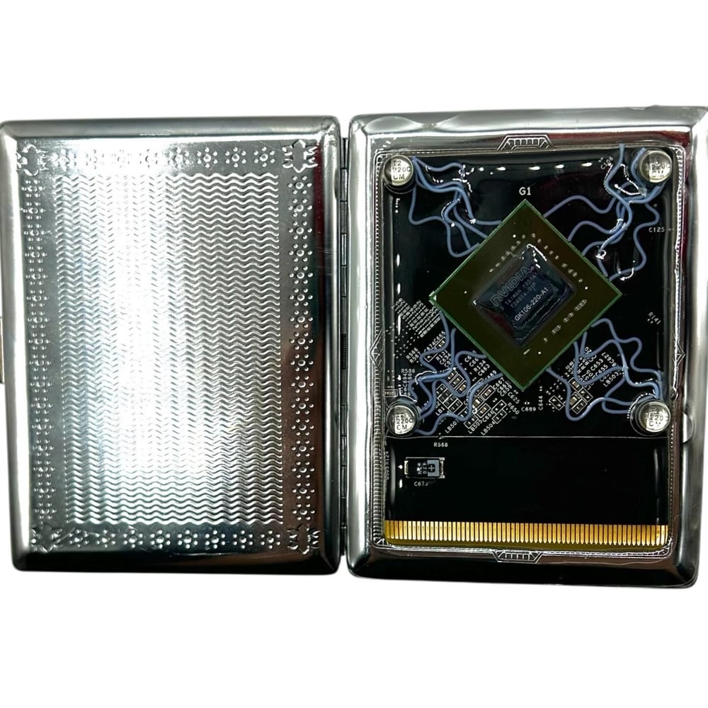 Cigarette case made from a MacBook π» circuit board and lavender wires dipped in resin. Holds up to 20 cigarettes standard, king-size, and long (100s/120s) . Or use it as a new wallet, itβs your world.