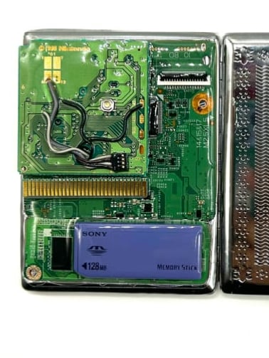 Left handed circuit cigarette case encased in resin stainless steel case.
