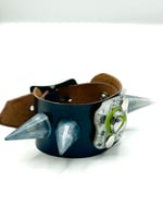 Leather is a blue black/black in the dark with a hint of dark blue in direct light.